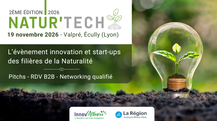 Innov’Alliance organise le 19 novembre 2026 à Lyon, la 2ème édition de Natur’tech, journée dédiée aux start-ups qui innovent pour la transition écologique et technologique des filières agricoles, agro-alimentaire, nutraceutique, cosmétique, aromes/parfums. Cet événement a pour ambition de mettre en lumière ces pépites et favoriser les rencontres avec les acteurs-clé de leur développement : grands groupes, investisseurs, PME, experts métiers et acteurs institutionnels.